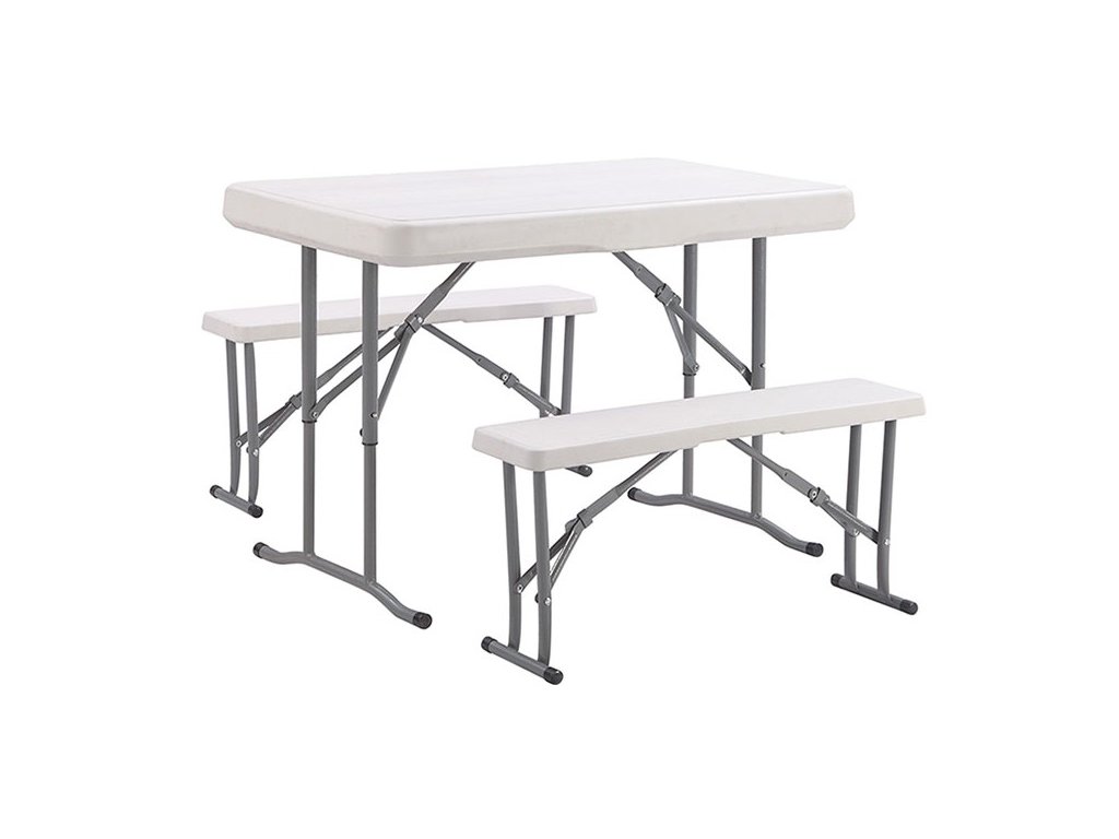 Užijte si příjemný čas s rodinou a přáteli s tímto praktickým skládacím piknikovým setem, který se skládá ze stolu a dvou lavic. Ideální pro venkovní použití - jako skládací zahradní stůl, campingový stůl, párty stůl nebo skládací venkovní stůl. Navržen pro snadnou manipulaci a rychlé složení.